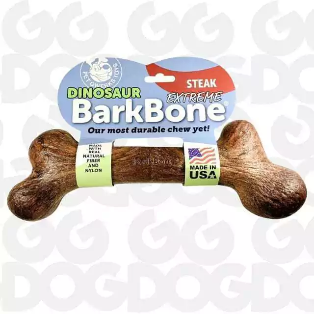 Dinosaur Barkbone Extreme Steak é o brinquedo de roer mais forte de toda a linha Pet Querks, destinado a cães com mordidas extremas.