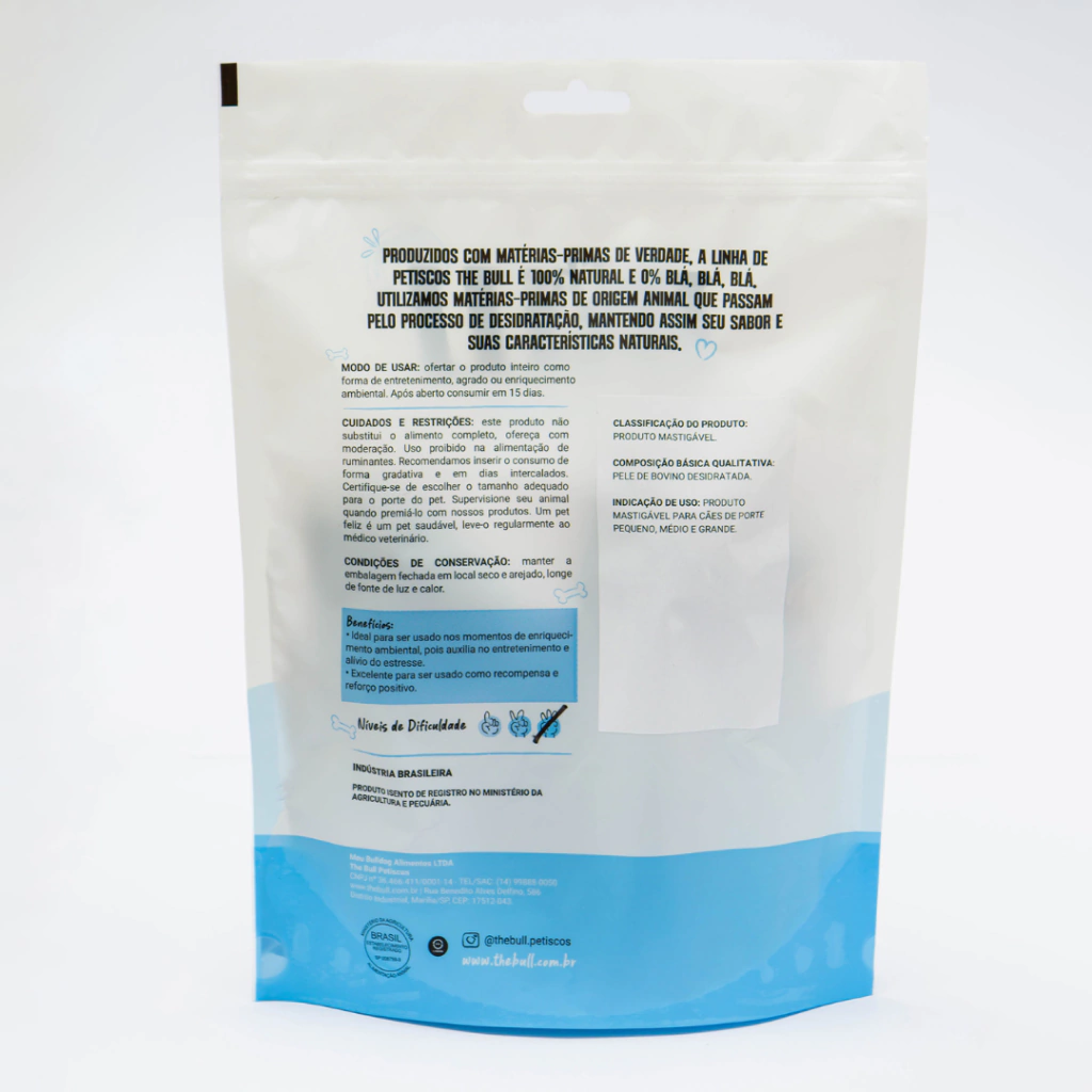 Composição: 100% pele bovina desidratada, sem aditivos ou conservantes.